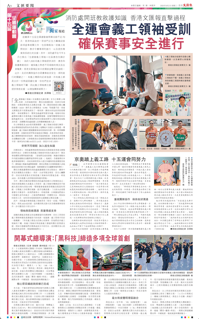 91/12259距離第十五屆全國運動會開幕尚餘不足70天,香港特區政府一眾部門正全力籌備迎接該項盛事相關工作,包括積極為一班義工展開培訓,務求令賽事順利進行,以及提供專業與系統化的支援。其中,消防處早在今年3月已推出「全運會義工領袖×社區應急先鋒計劃」,為約1,500名義工領袖提供消防、應急和救護專業培訓,確保義工熟悉不同場館的情況及自身職責。香港文匯報記者日前獨家直擊受訓過程。此外,良好的團隊協作亦是賽事能否安全、順利進行的關鍵之一,有義工導師向記者強調,所有義工都是出於一份熱誠貢獻社會,但他們並非義工領袖的下屬,因此義工領袖應注重提供情感支援,以增強團隊凝聚力。●香港文匯報記者 洪澤楷